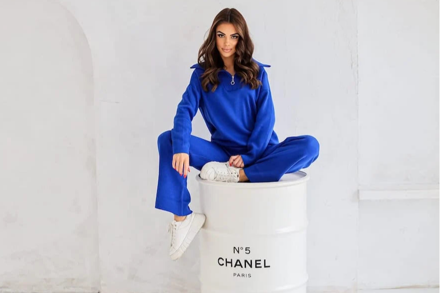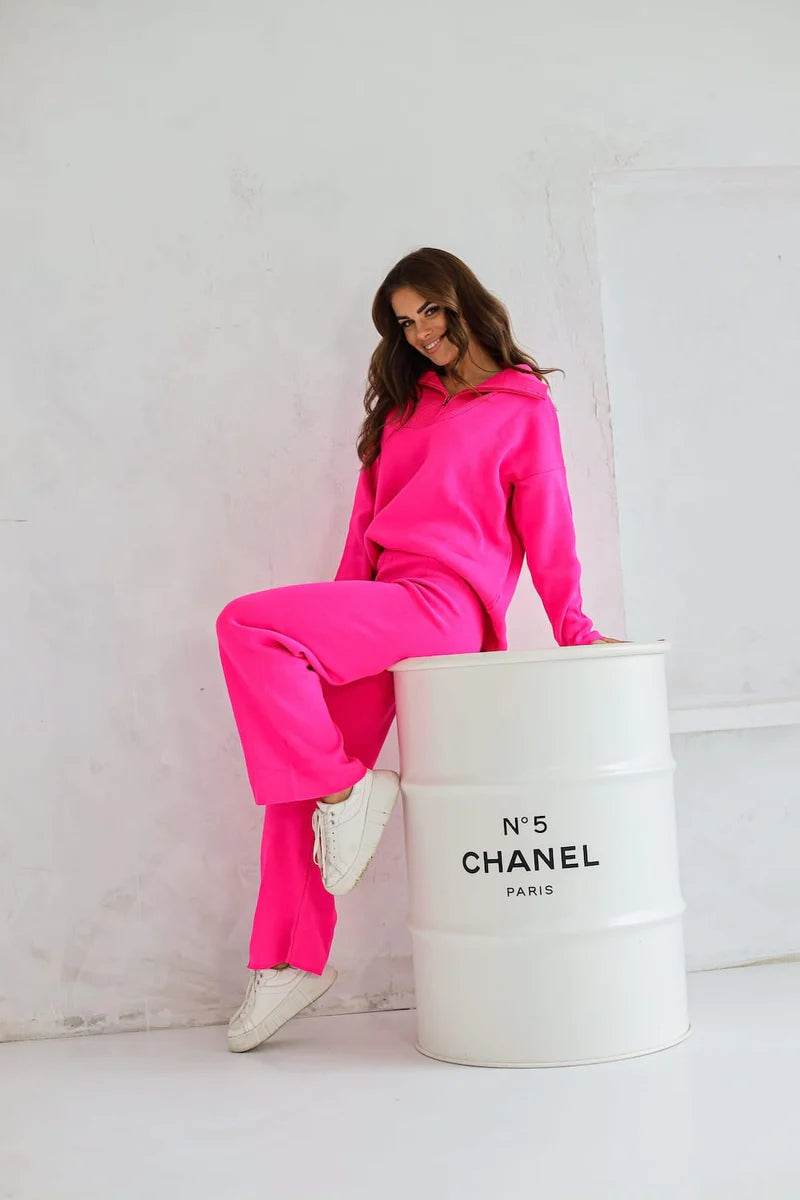 Women's two-piece sweater set, including: Loose trousers and a sweater with a button-down collar. Pants flared downwards with an elastic waistband that fit perfectly to the waist. The blouse has a comfortable, oversize cut. The collar of the blouse can be buttoned and used as a turtleneck. The neckline has an interesting, ribbed accent, giving the sweater an interesting look. The set is very universal, you can wear it together or separately, combining each element with other parts, creating many casual styles. It is also an ideal proposition for women who value comfort, original appearance and a sporty lifestyle.