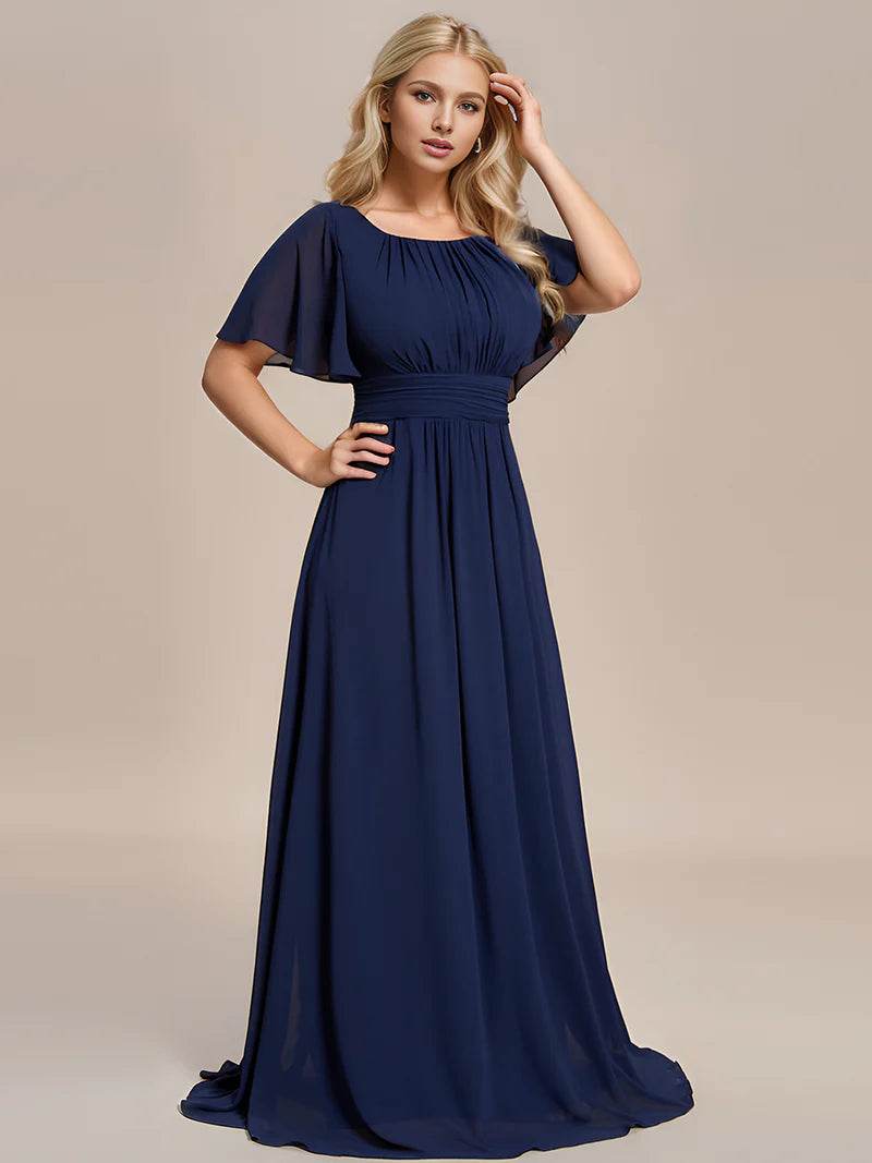Pleated Bridesmaid Dress – Round Neck Elegant Gown for Weddings