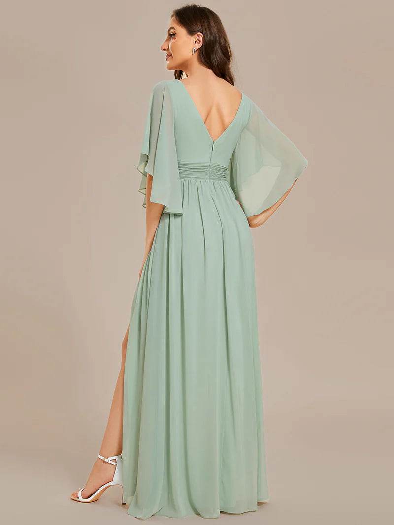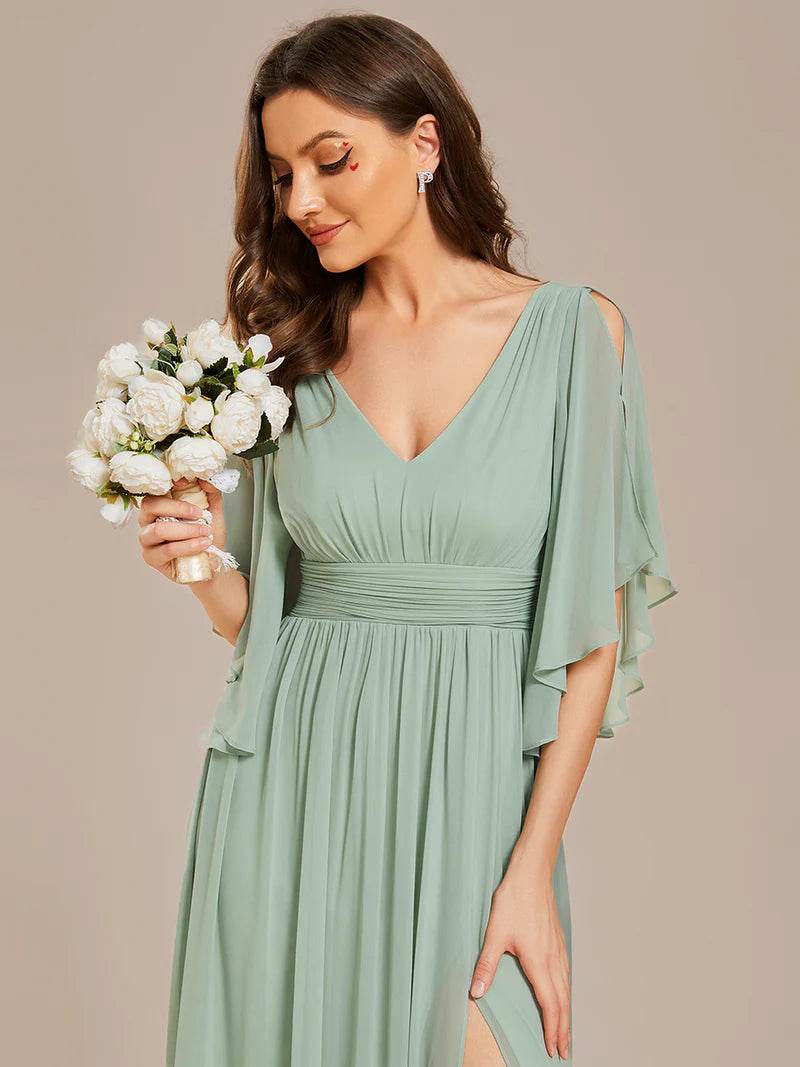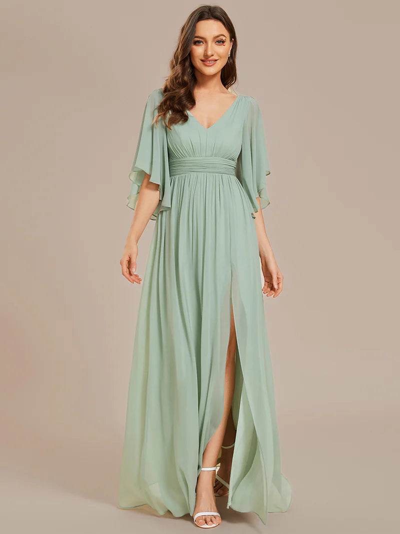 V-Neck Chiffon Mint Green Bridesmaid Dress – Pleated Design with Waist Belt